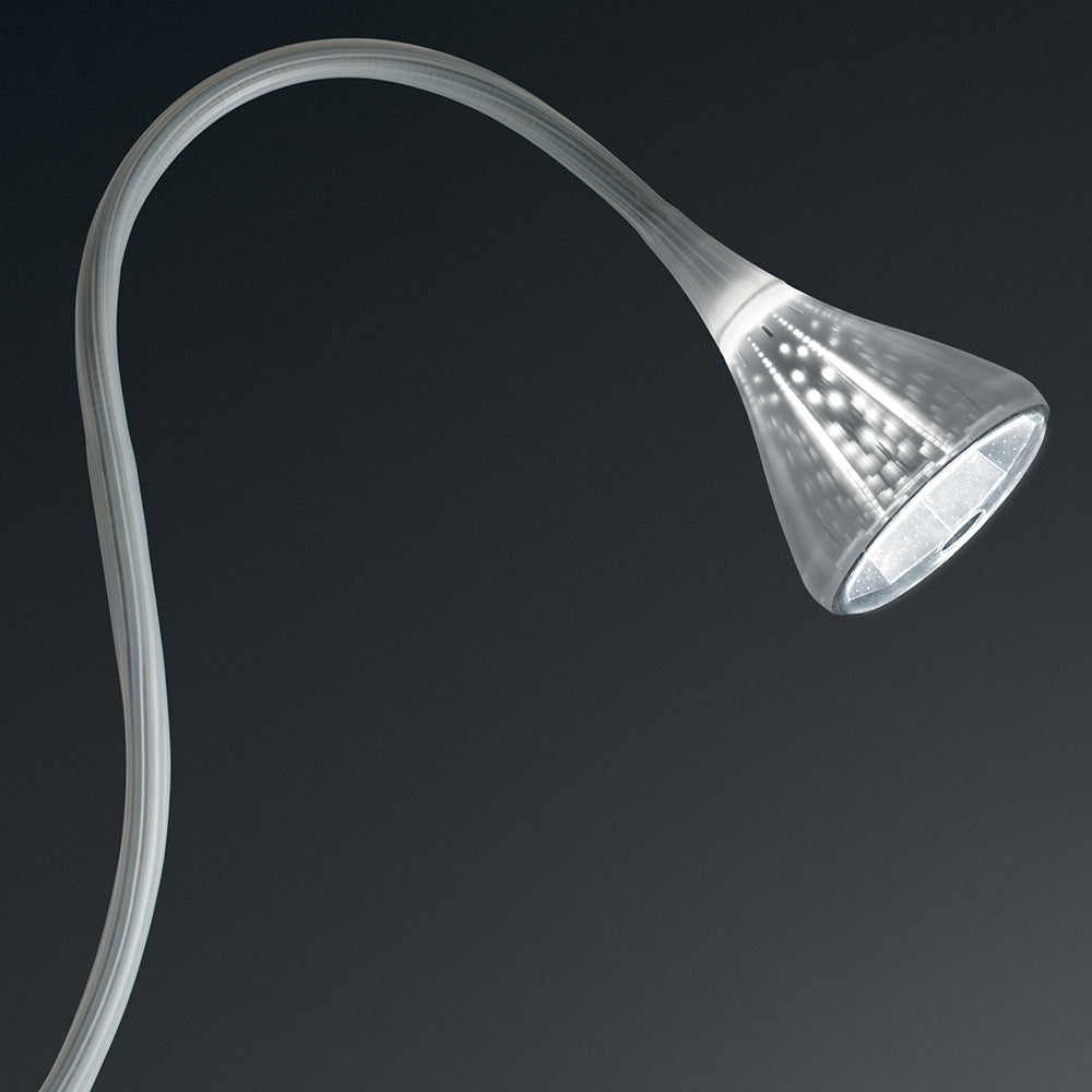 A flexible arm encased in natural platinic (anti-yellowing) silicone holds a randomly-perforated, mirrored-aluminum reflector diffuser covered in transparent rubber-effect polycarbonate.