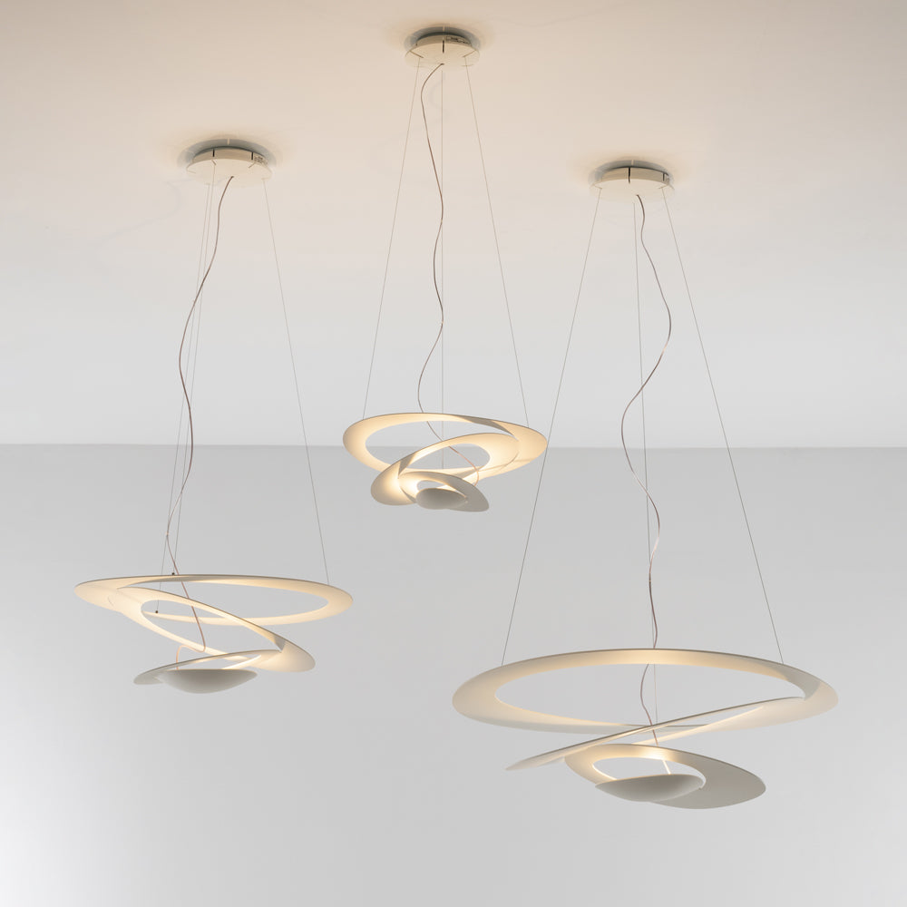 Spirals gently descend delivering sculptural light effects. Painted aluminum body in white or black.