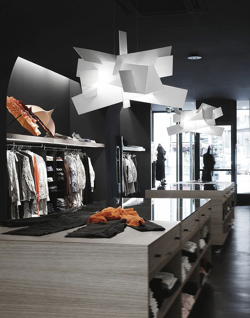 An apparently chaotic stack of surfaces, this ceiling lamp has a design featuring explosive creativity and dynamism.