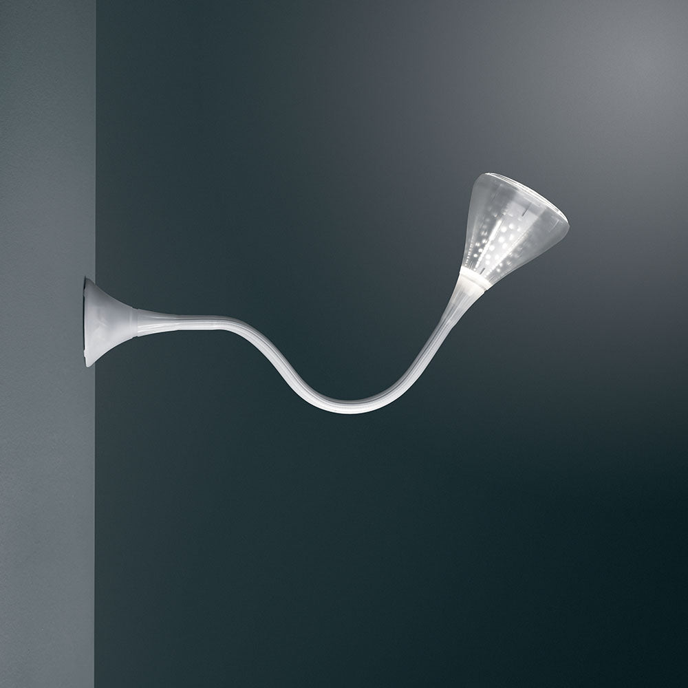 A flexible arm encased in natural platinic (anti-yellowing) silicone holds a randomly-perforated, mirrored-aluminum reflector diffuser covered in transparent rubber-effect polycarbonate.