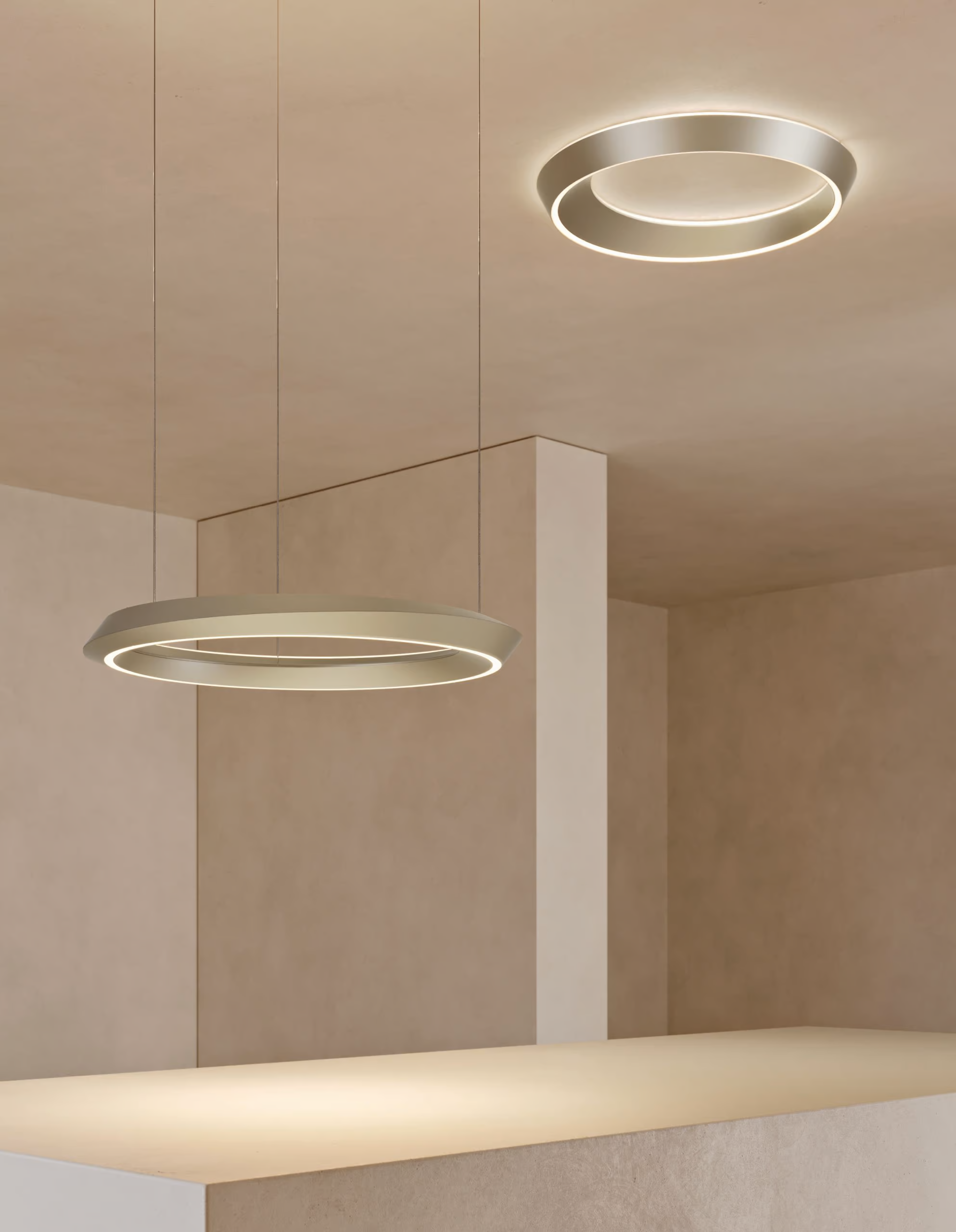 Tidal is an elegant collection of lamps with exceptional luminous efficiency. Its fluid, impactful design, inspired by the movements of celestial bodies and tides, creates a dynamic visual experience – appearing differently from various viewing angles thanks to the ring’s irregular, asymmetrical shape, with one side wider than the other. Tidal emits light both downward and upward, with all technical elements concealed within the compact, slim lamp body, highlighting its aesthetic appeal.