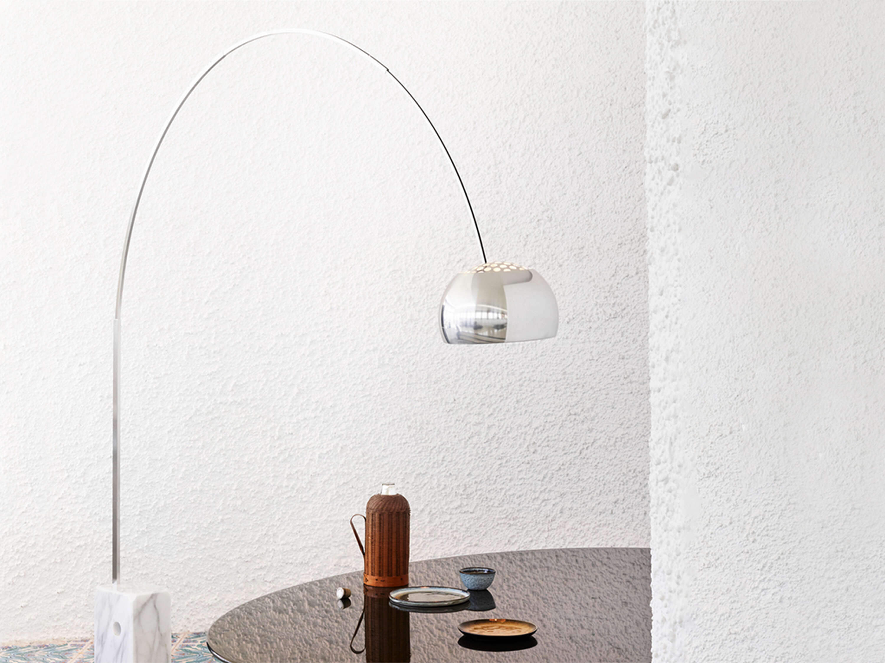 Floor lamp with direct light. Base in white Carrara marble. Telescopic foot in satin stainless steel. Adjustable and height-adjustable reflector in stamped, polished and blued aluminum.