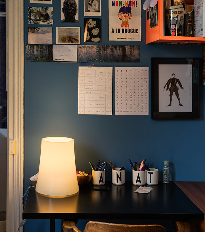A table lamp with a poetic and essential design, accessible and extraordinarily versatile. The translucent white shade matches the metal base and rod with 6 different colors for 6 different personalities. Perfect as a bedside lamp.