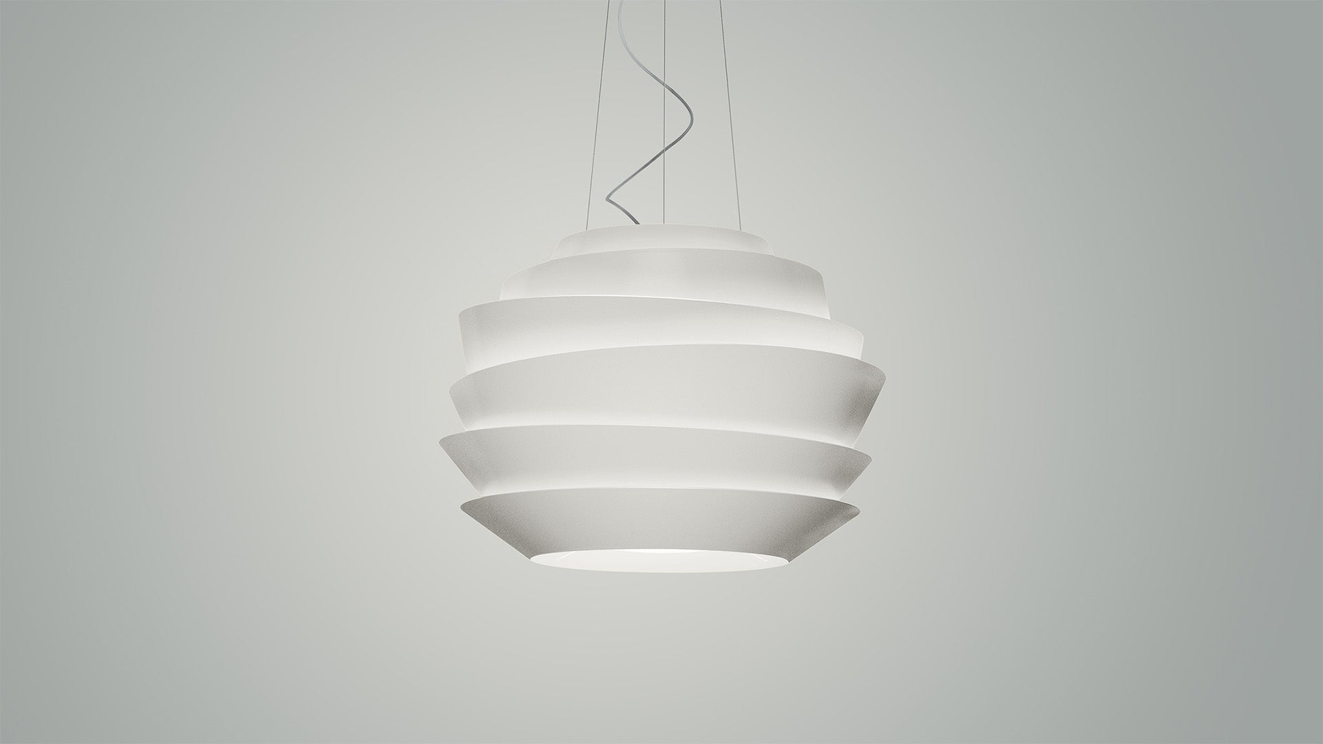 A true center of visual attraction, the Le Soleil suspension lamp is made up of irregular bands that create a fascinating play of reflected and diffused light. A suspended architecture that evokes the profile of the Guggenheim Museum in New York.