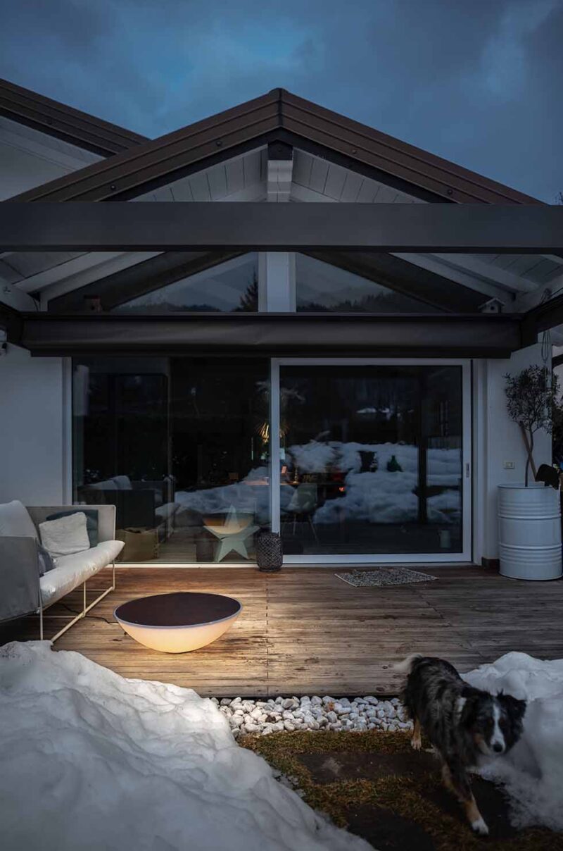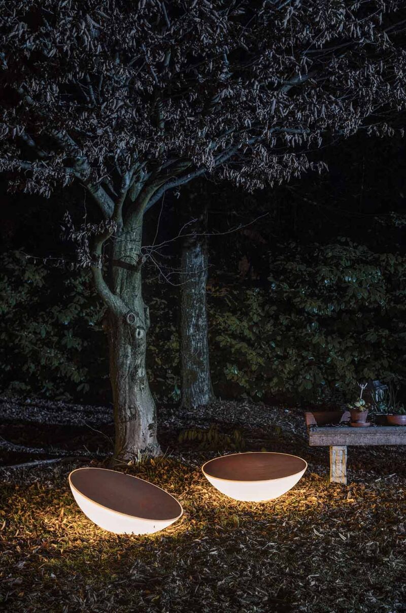 The Solar outdoor lamp is in tune with a transversal concept of living, in which the garden can become a daytime environment. It is not just a lamp, but a contemporary home around which to gather and converse outdoors. The support base becomes a small table on which to place objects.