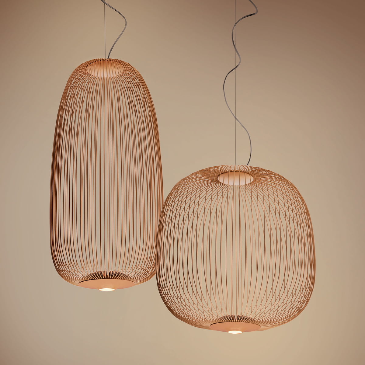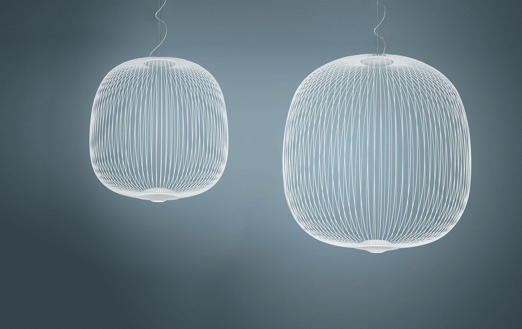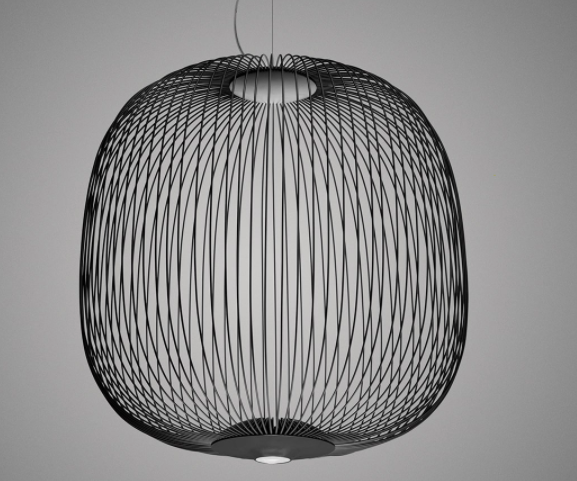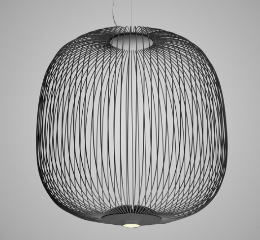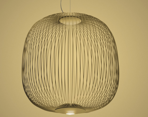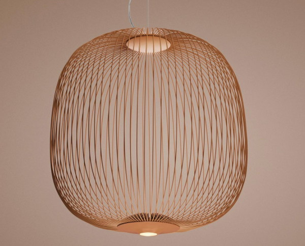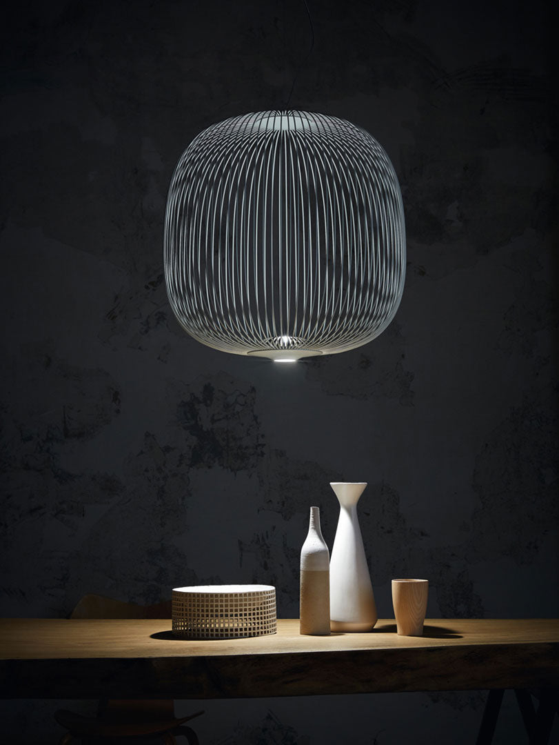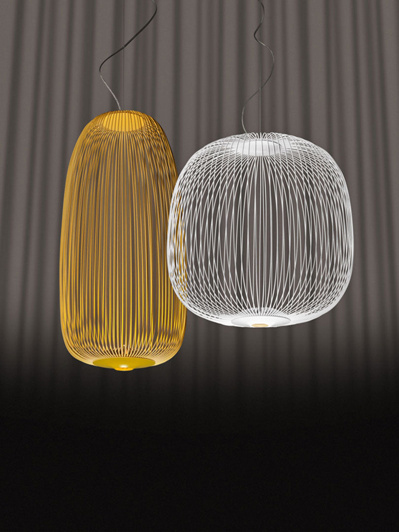 Spokes expresses a feeling of lightweight and motion. As if crossing a magical and geometrical mesh, the light filters out from the inside, projecting a kaleidoscope of blocks and voids. The shape of the Spokes 2 suspension lamp recalls a lantern or an aviary.