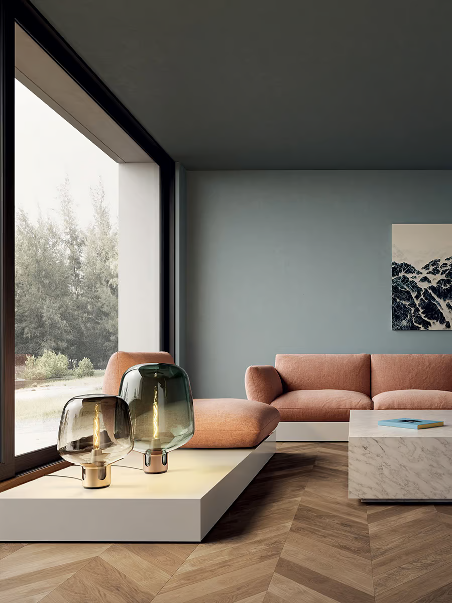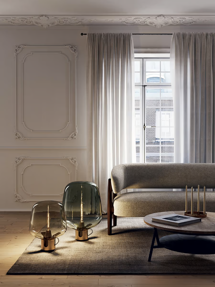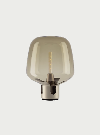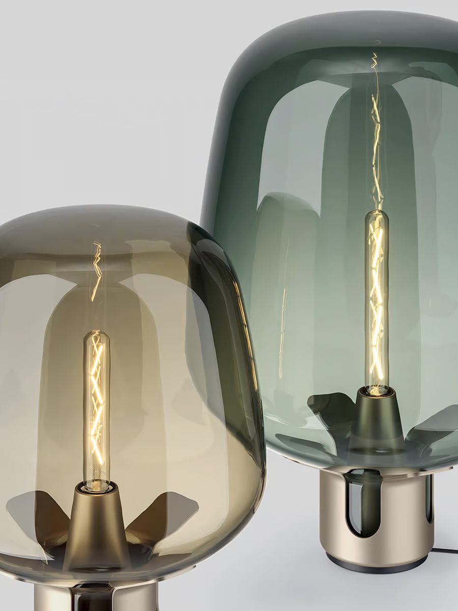 Inspired by traditional storm lanterns which use glass pipes to protect the flame, Flar features a billowing glass shade designed to surround an LED filament bulb, to magnify the light source and diffuse a very soft light, filtered by the tinted glass, almost like a contemporary candle.