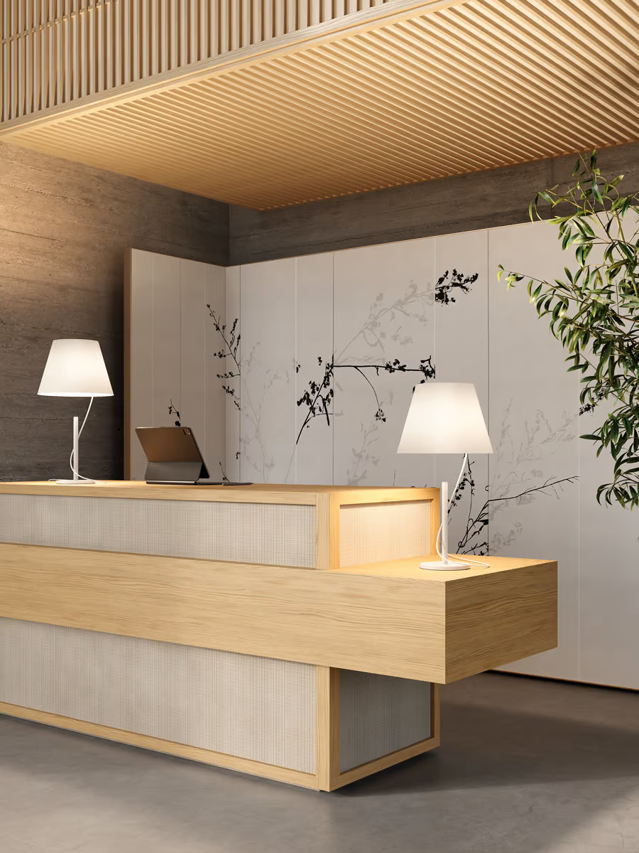The shade comprises a sheet made from a special compound of paper and polymer film, further emphasising the lightness of the design language while extending its durability.