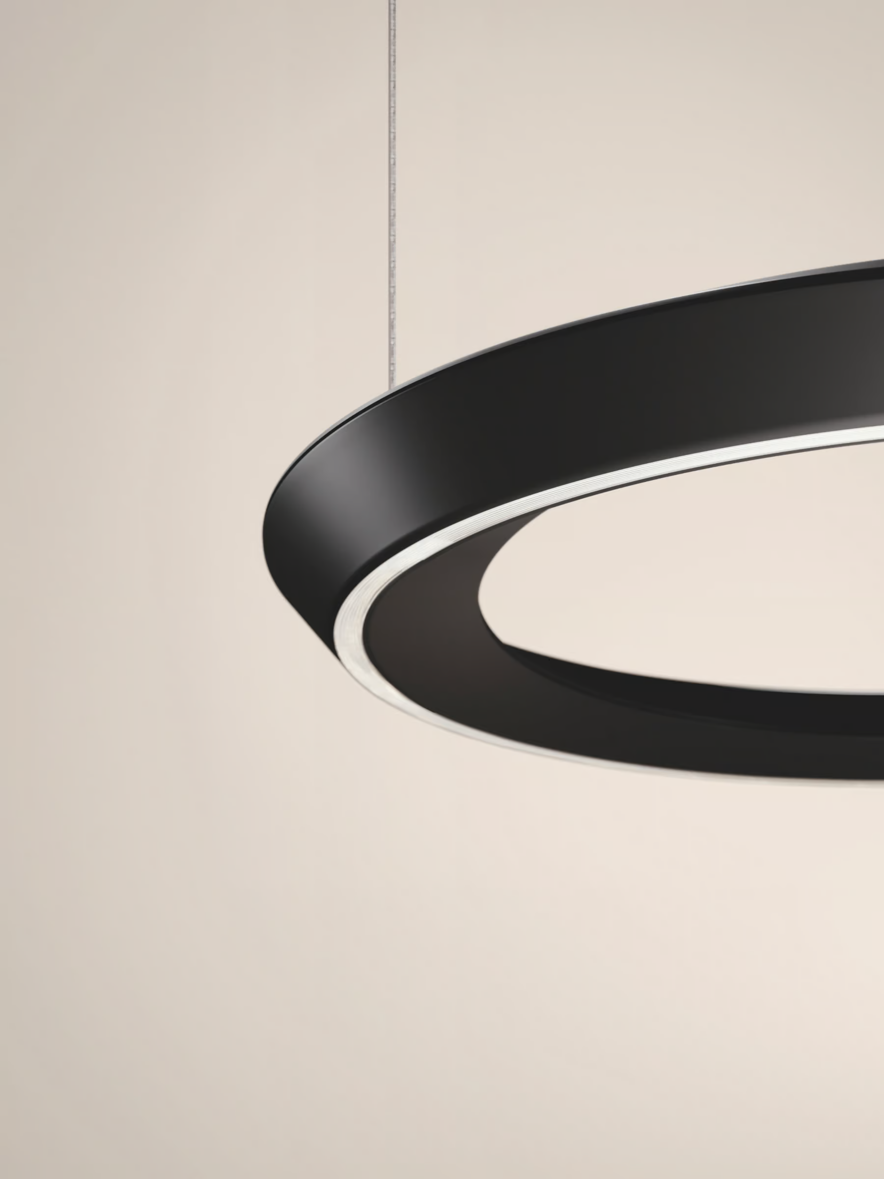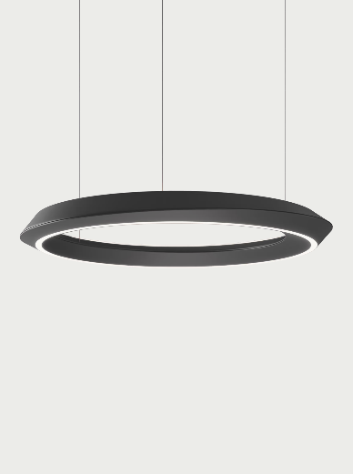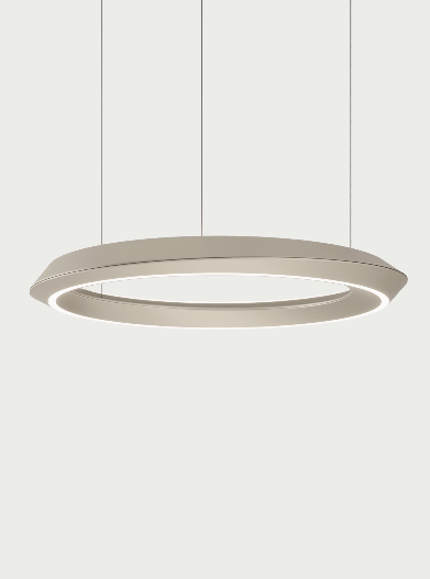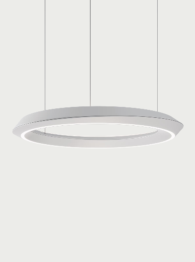 In the stand-alone pendant version, the lamp’s main body has been redesigned with a double-shell structure that balances direct and indirect light emission, preventing glare. This design adds an extra sense of twist and dynamism to the ring, which appears to hover in the air with a light, refined presence, transforming any space with its soft, dynamic lighting effect.