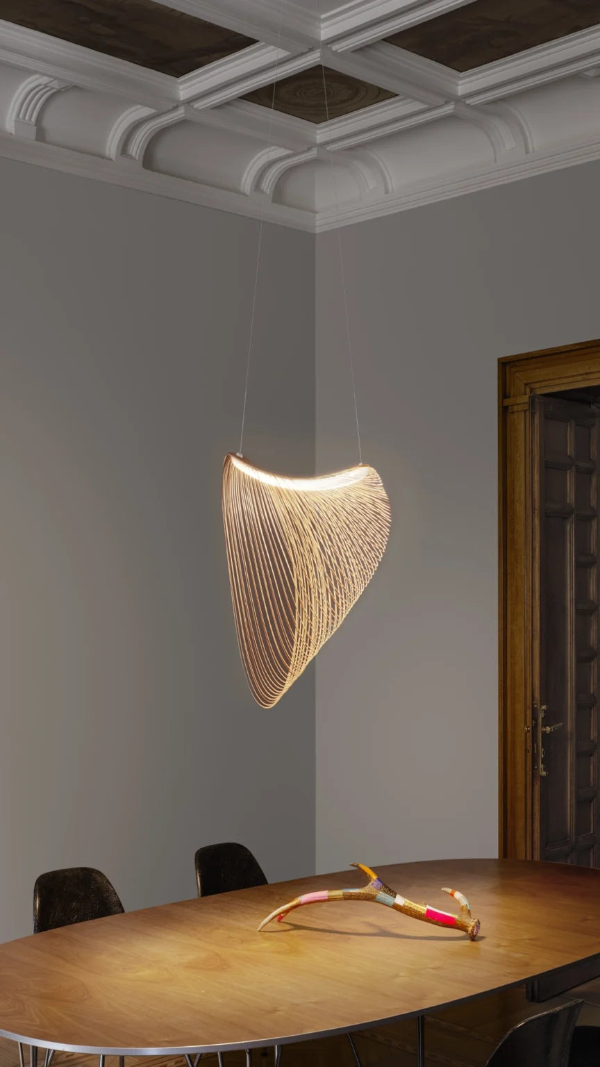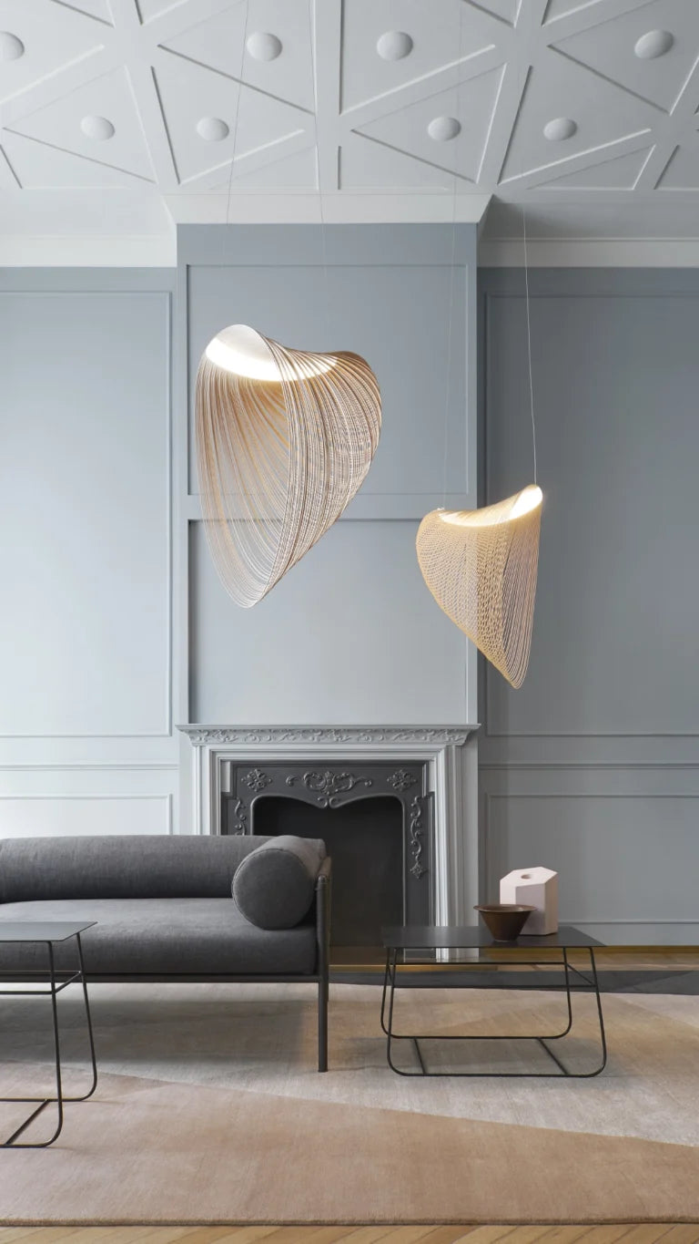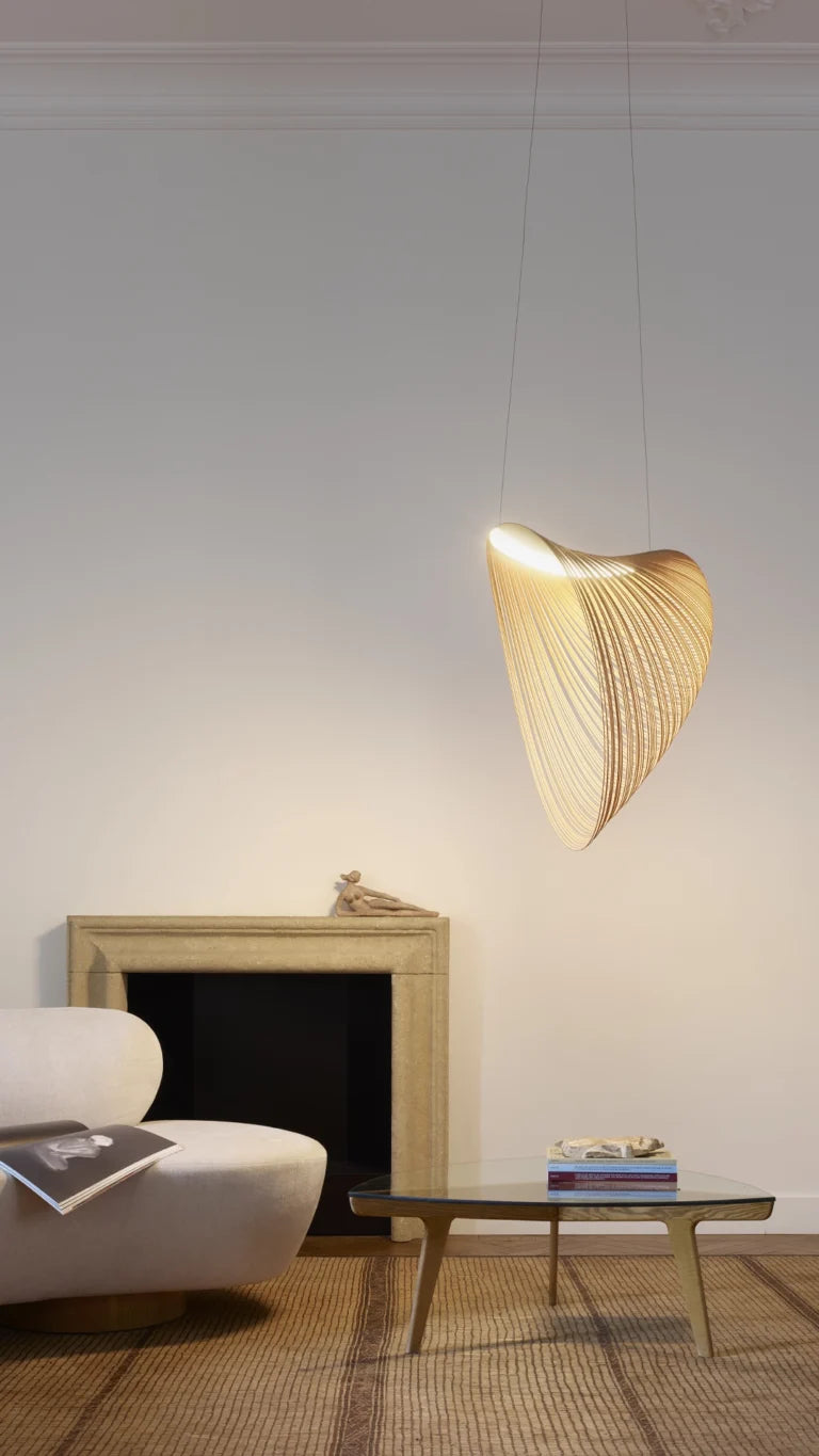 The lamp is composed of a very light body made with extremely thin, flexible plywood, cut by laser along densely packed equidistant lines. This is a precious and varying material whose unique natural character can be seen in the typical grain pattern. These characteristics are the distinctive features of the project. Once suspended from the ceiling, Illan takes on volume thanks to the force of gravity and assumes its characteristic form that floats in the air.