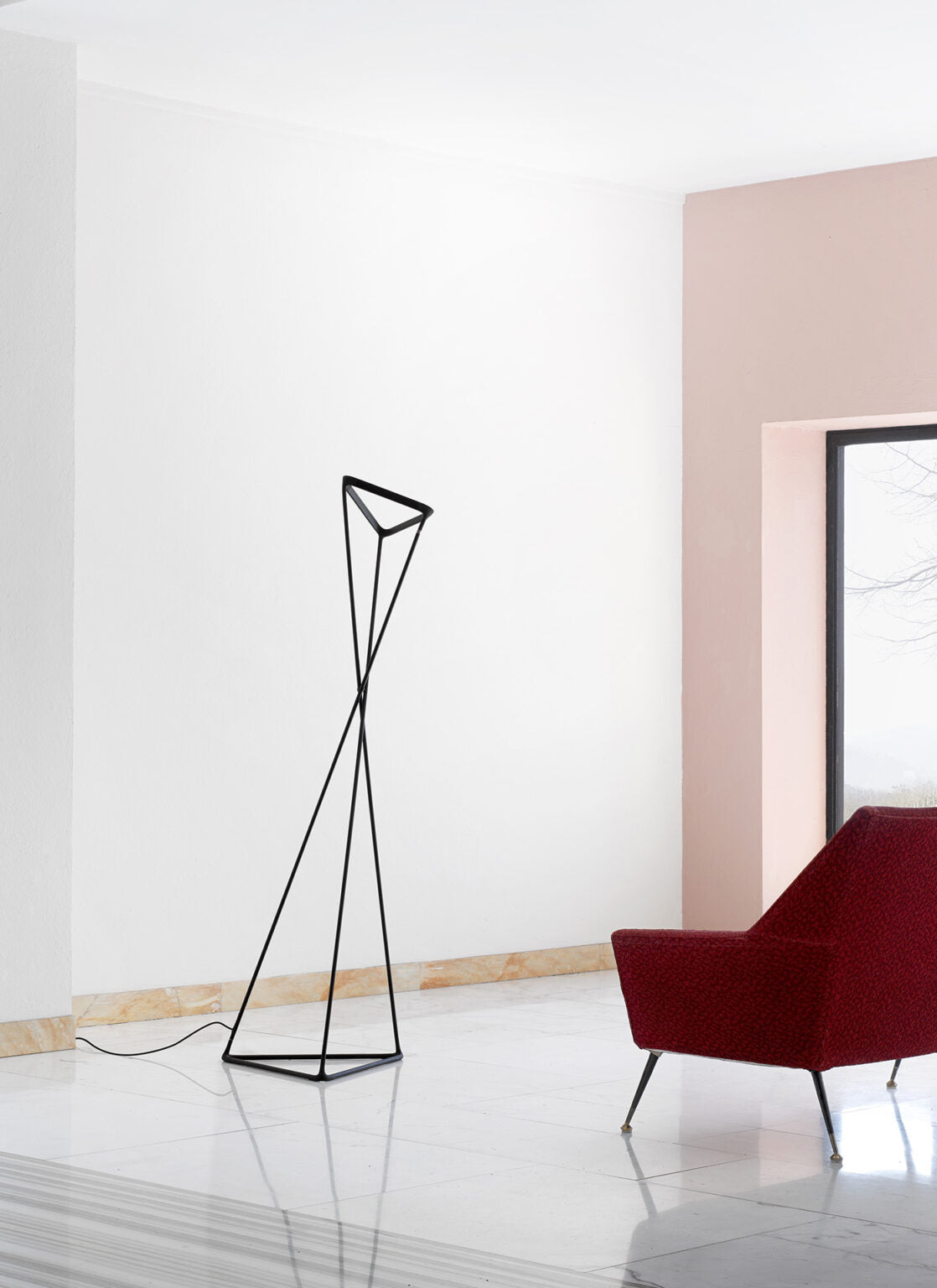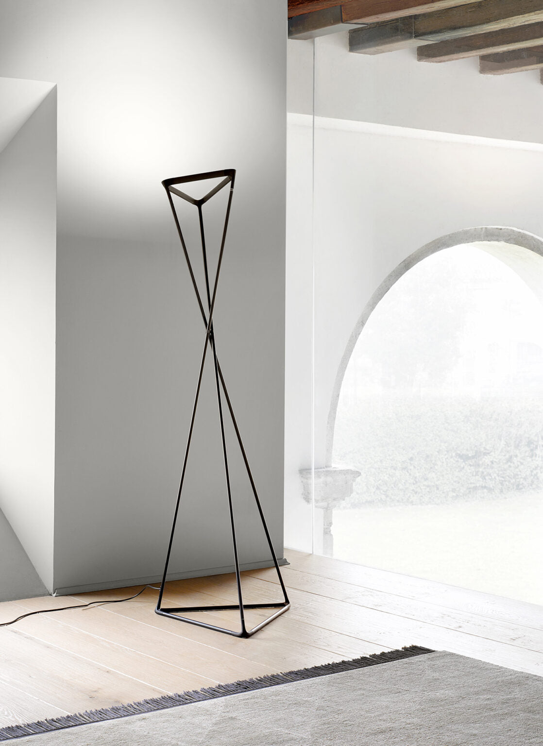 An innovative floor lamp for indirect lighting. Mounted on a triangular steel base, the jointed structure of the lamp composed of three mobile aluminium shafts with elastomer joints nimbly lends itself to a fluid mechanical torsion movement that is propagated up to the top of the lamp, or at the position of the reflector, which is also triangular, setting its angle and making it possible to direct the light where it is needed.