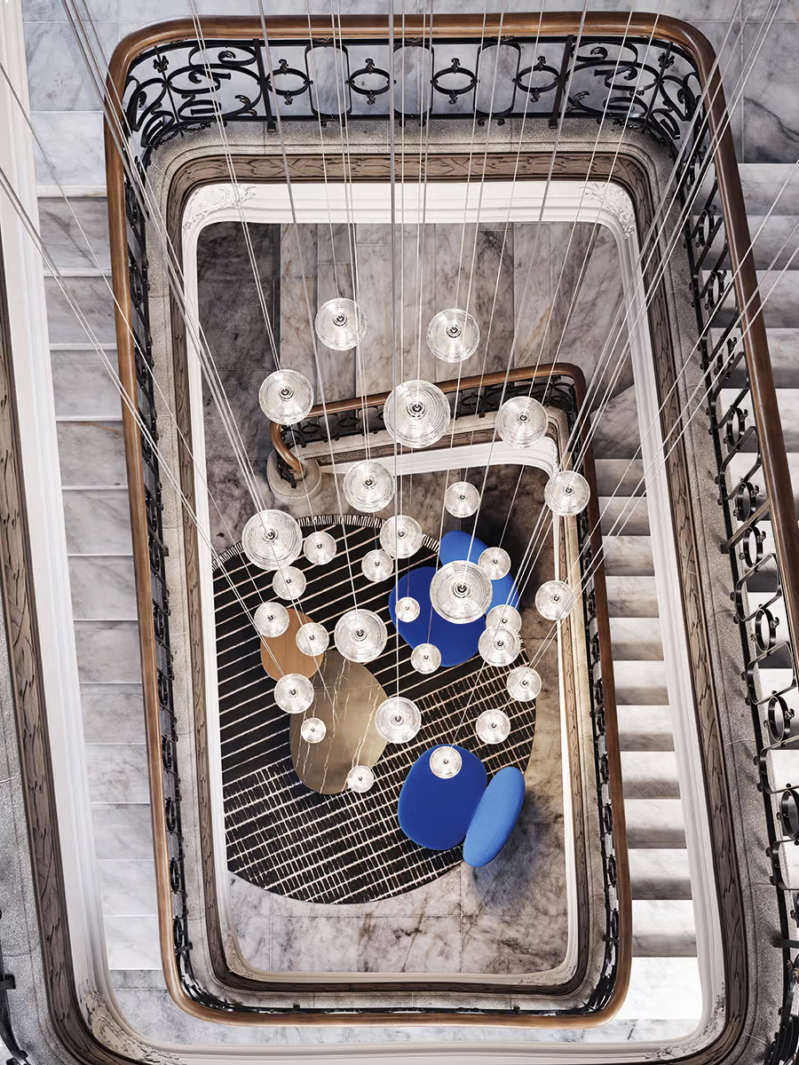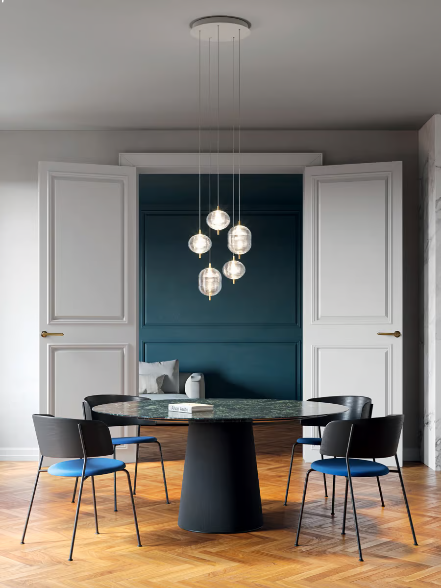 The Jefferson suspension lamp designed by Luca Nichetto is reminiscent of music and iconic images in psychedelic works of art from the 1960s. The vortex motif decorating the diffuser is embellished by the timeless classicism of Bohemian crystal, which diffuses evocative atmospheres of light. Dynamic in both its many sizes and multiple compositions, Jefferson’s elegance keeps up with the excellent performance of LED interior lighting.