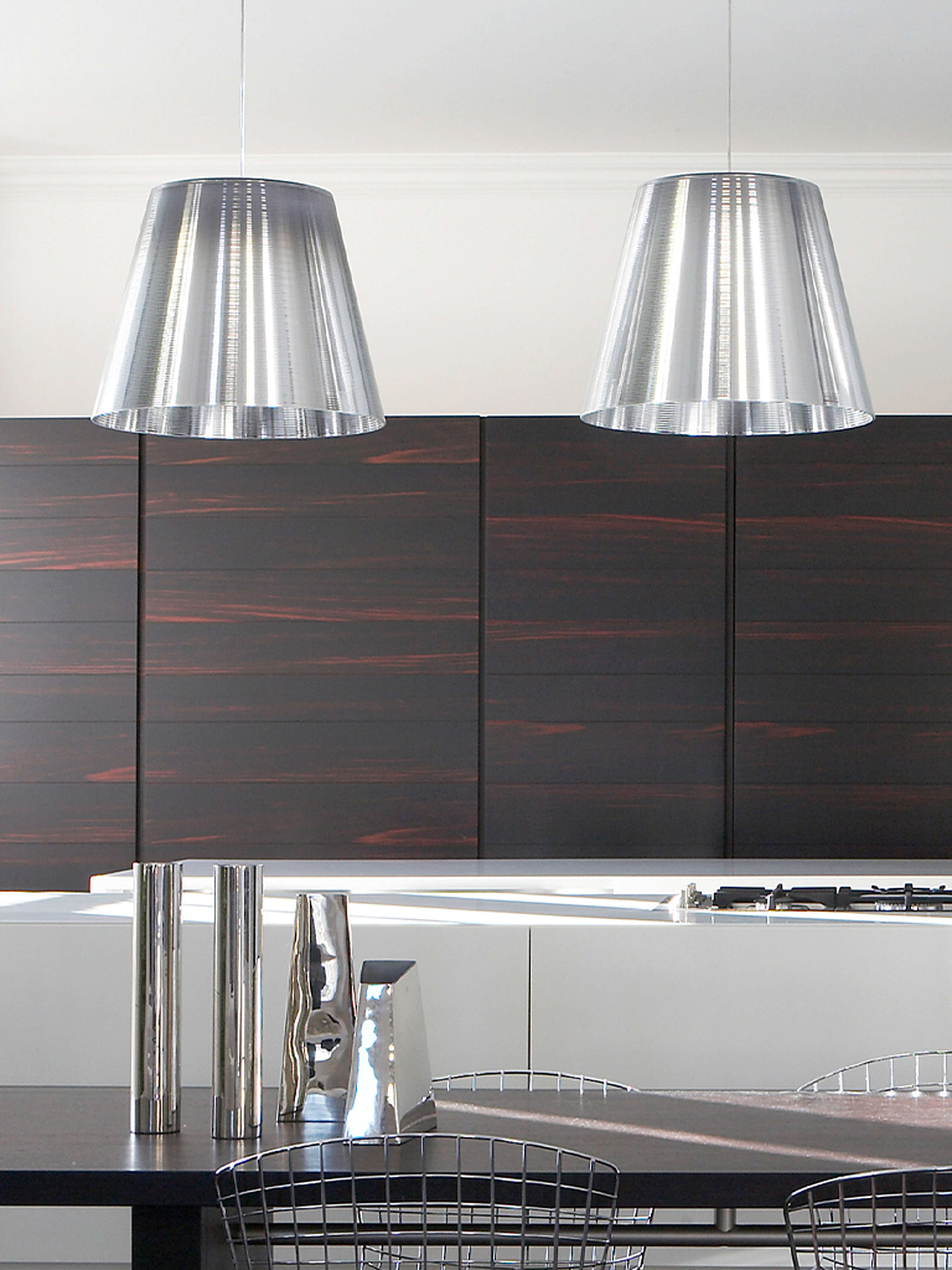 A member of the KTribe family of products, this inspiring pendant light provides diffused light through a transparent diffuser that gracefully moves the eye upward. The inner diffuser is PC (polycarbonate) with a white opal finish. The outer diffuser is fumèe PMMA (polymethyl methacrylate) with silver on the inner surface applied by vacuum aluminum coating. There is a single support cable and a white ceiling rose. Inspiration behind the design: Designer Philippe Starck is known for an ability to create objects that "demand the most from the least," and the KTribe family of products is no exception to that rule. Streamlined and smart, it pushes boundaries while reflecting his focus on positive reduction and environmental consciousness.