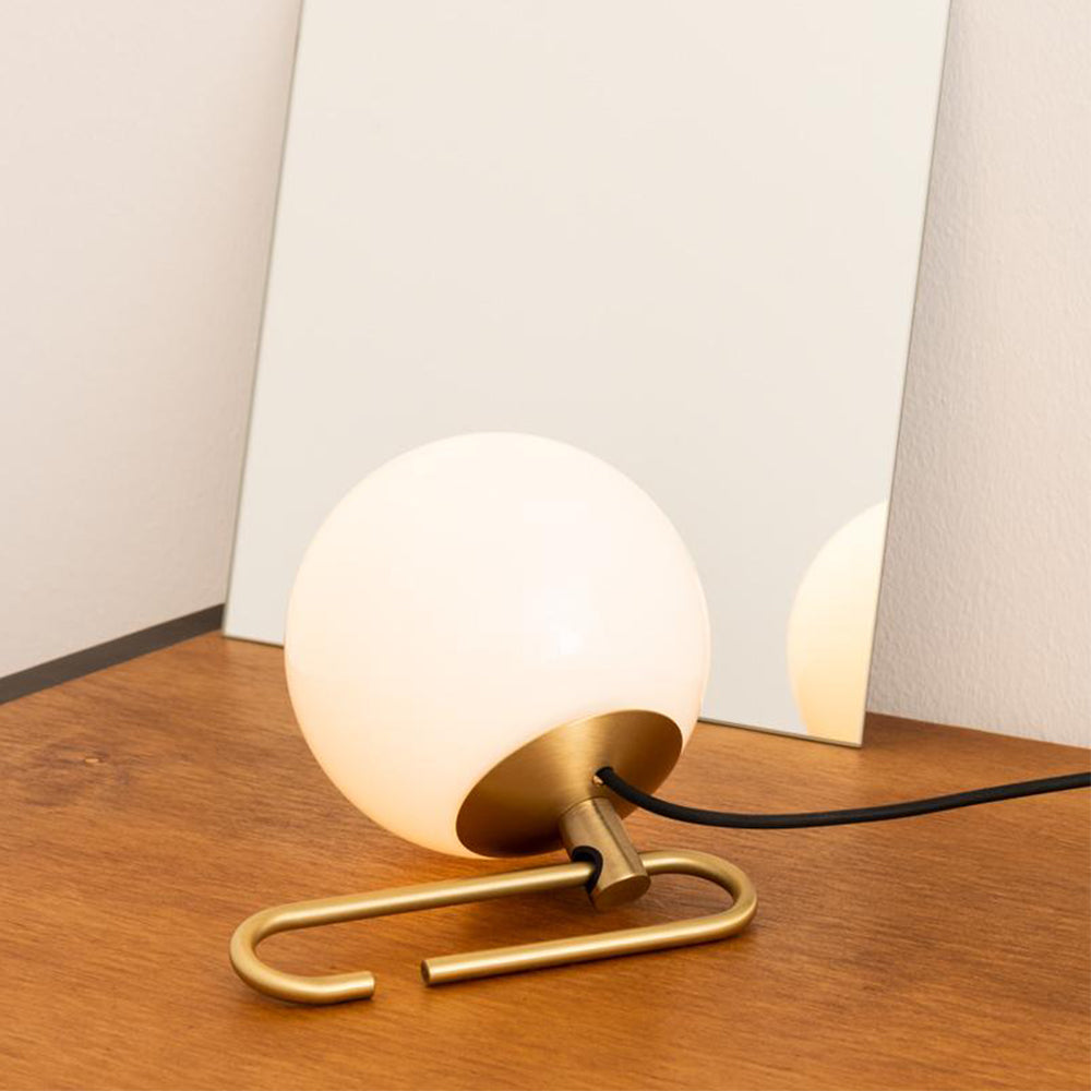 Material: A white blown glass sphere slides along a brushed brass ring.