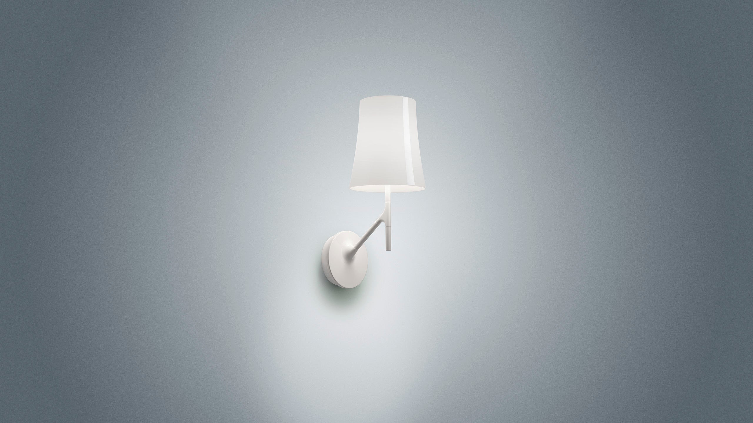 The Birdie family of lamps interprets the shape of the classic lampshade-lamp with a designer twist. The wall lamp version is a friendly, highly versatile presence thanks also to the availability of several diffuser colours.
