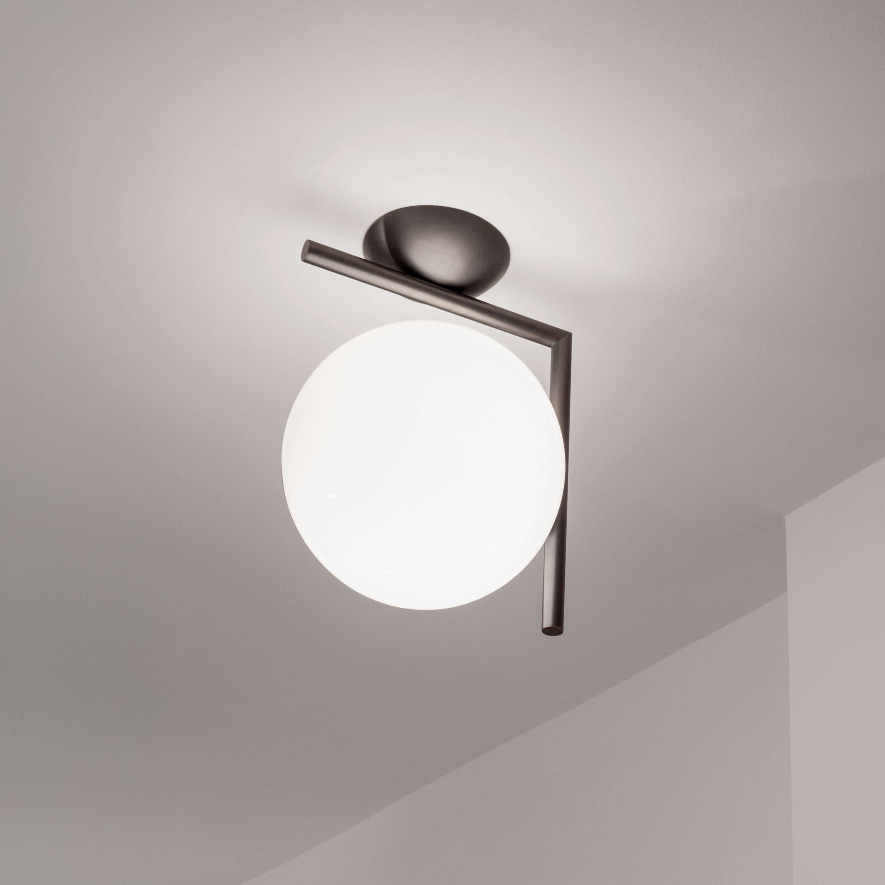 Wall/ceiling lamp with diffused light. Brass structure, brushed and transparent lacquered or chromed steel. Opal blown glass diffuser.