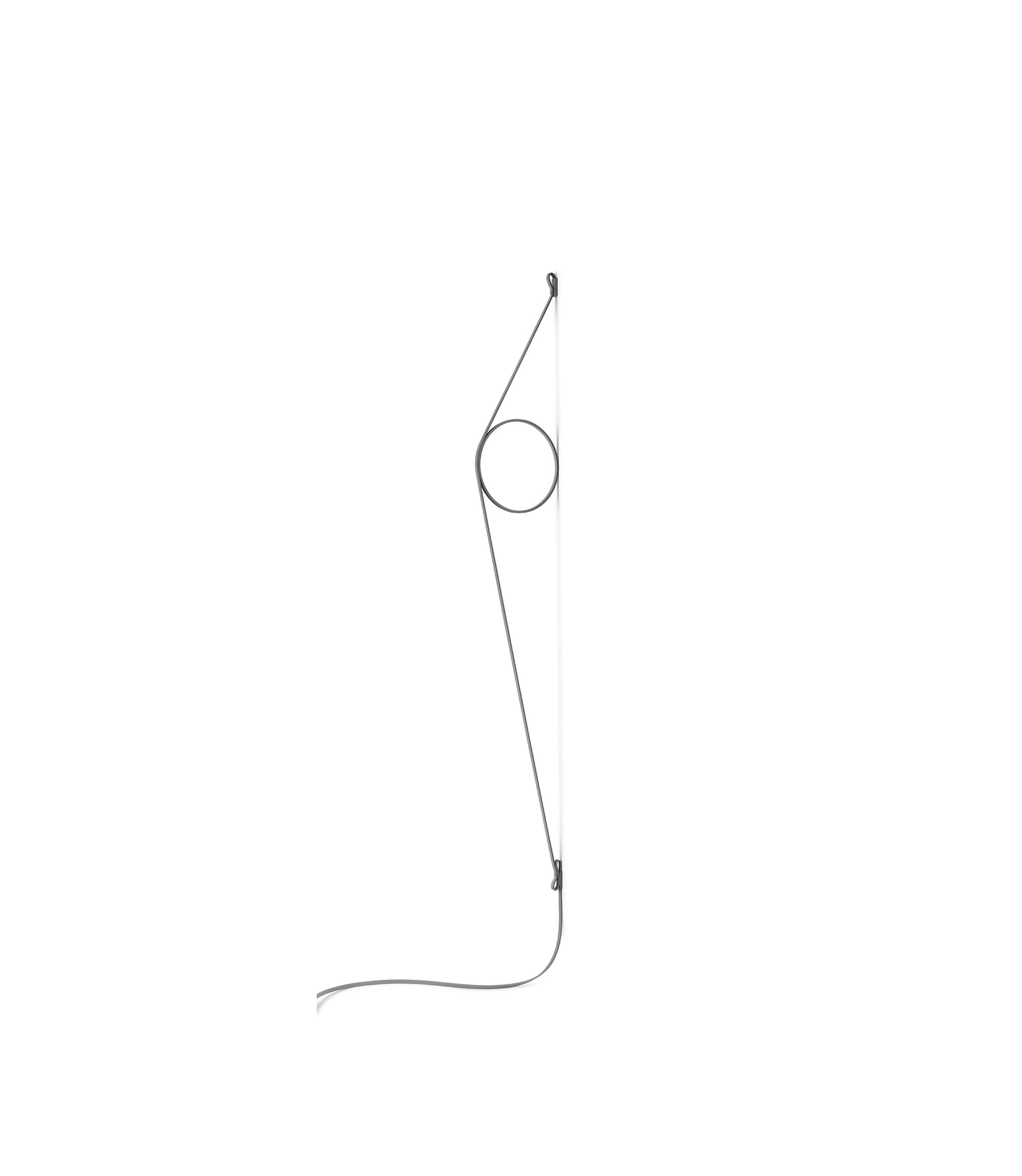 Wall lamp with indirect light composed of a calendered extruded aluminum body finished by galvanic process or painting. The special tangent cable, in colored rubber, guarantees the power supply. The cable is fixed to the wall with ABS joints in the same finish as the ring. Dimming function by means of a foot switch on the cable. Plug power supply with interchangeable plugs. The useful length of the cable is 2.5 meters.